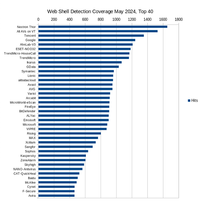 To showcase the effectiveness of THOR in detecting web shells, we recently conducted a comparison study. We compared the web shell detection coverage between THOR and 70 antivirus solutions on VirusTotal. The study utilized the largest and most respected web shell repository on GitHub, curated by Tencent. By analyzing files identified as web shells by either THOR or any of the antivirus solutions on VirusTotal, we found that THOR consistently outperformed other solutions in detecting web shells.