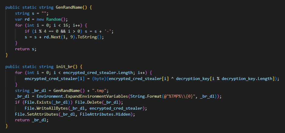 The tasks start by generating a random name for the credential stealer, decrypting and storing it in the temp directory and setting its attributes to “Hidden”.