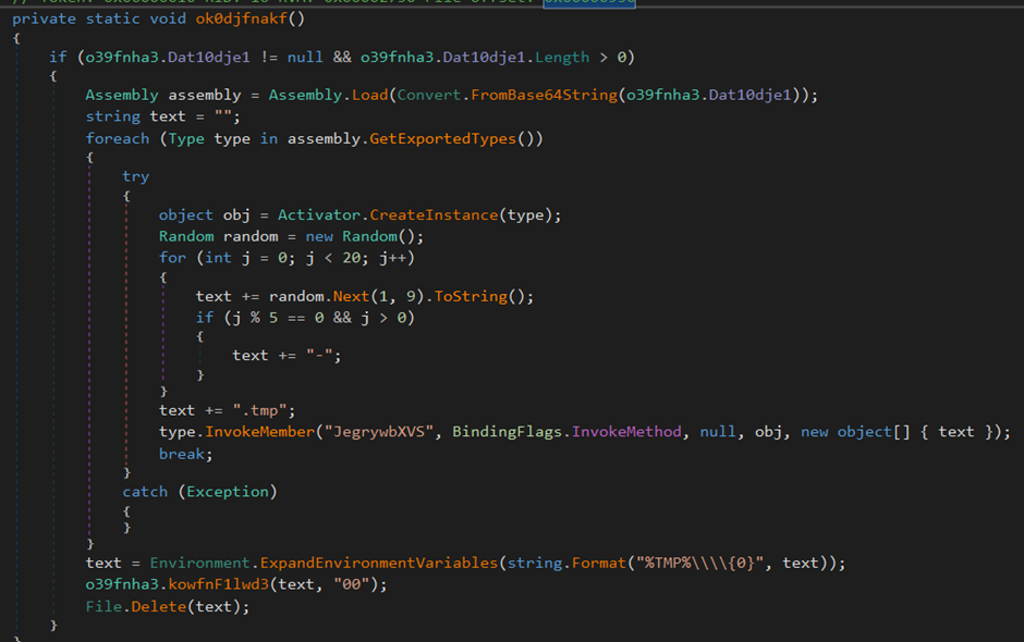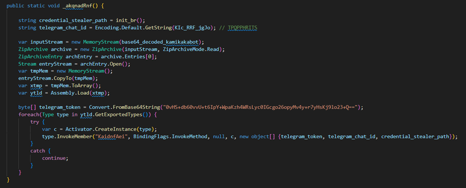 It then decodes and decrypts the main KamiKakaBot payload, which results in a ZIP file. This ZIP file is opened, and its entry is the DLL that will be directly loaded into memory and executed via the “InvokeMember” function.