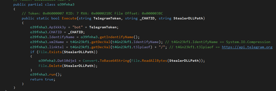 KamiKakaBot starts by decrypting the passed “Telegram Token” and calling the “Execute” function to start the execution.