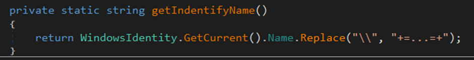 - It sets the variable “IdentifyName” by calling the “getIndentifyName” function. Which is a function that uses the “WindowsIdentity” class from .NET in order to obtain the current user information. The results will be in the form “Domain+=…=+Username”