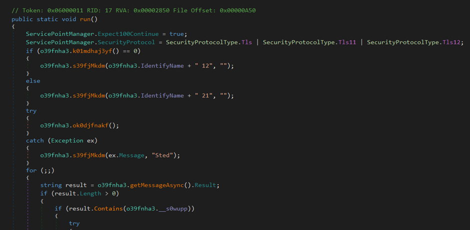 The “Run” function is the “real” main function of KamiKakaBot. It starts by calling a function called “k01mdhaj3yf”.