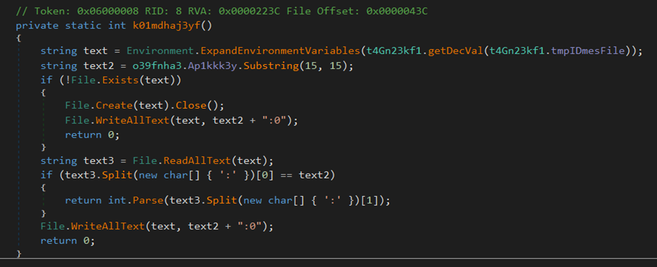 While the 2 first conditions are straightforward. In order to obtain the current MessageID value, the function reads the contents of the file “3f88dd57-6ce606be-54c358fb-c566587a.tmp” from earlier and extracts the value stored after the colon.