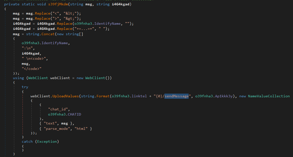 The function “s39fjMkdm” will simply take the results from the previously set “IdentifyName” variable and send it to the attacker by using Telegram’s “sendMessage” API.