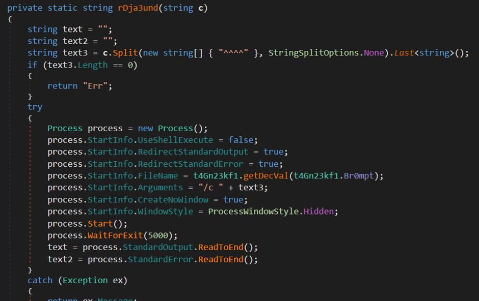 If none of the above is sent then the command is passed on to the “s39fjMkdm” function, which will execute it via “Cmd.EXE”.