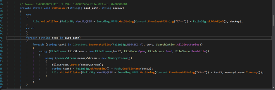 - It then checks if the credential stealer file that was passed as an argument from the previous step and that resides on disk. If it does, then it converts its content into base64 for later use, stores it in the “Dat10dje1” variable and then deletes the file from disk.