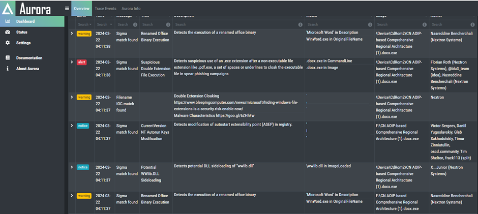 KamiKakaBot TTPs offer many detection opportunities that are easily detectable using public Sigma rules. For example, using our endpoint agent Aurora we can see many alerts triggering just for the first stage.