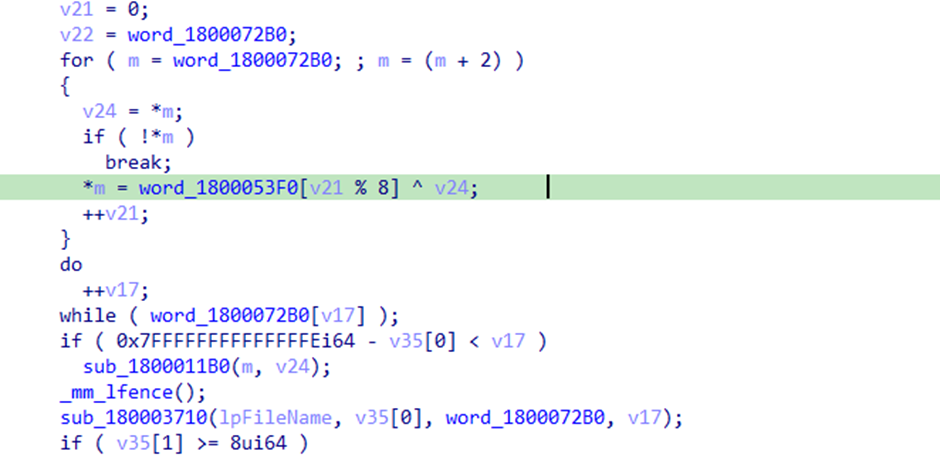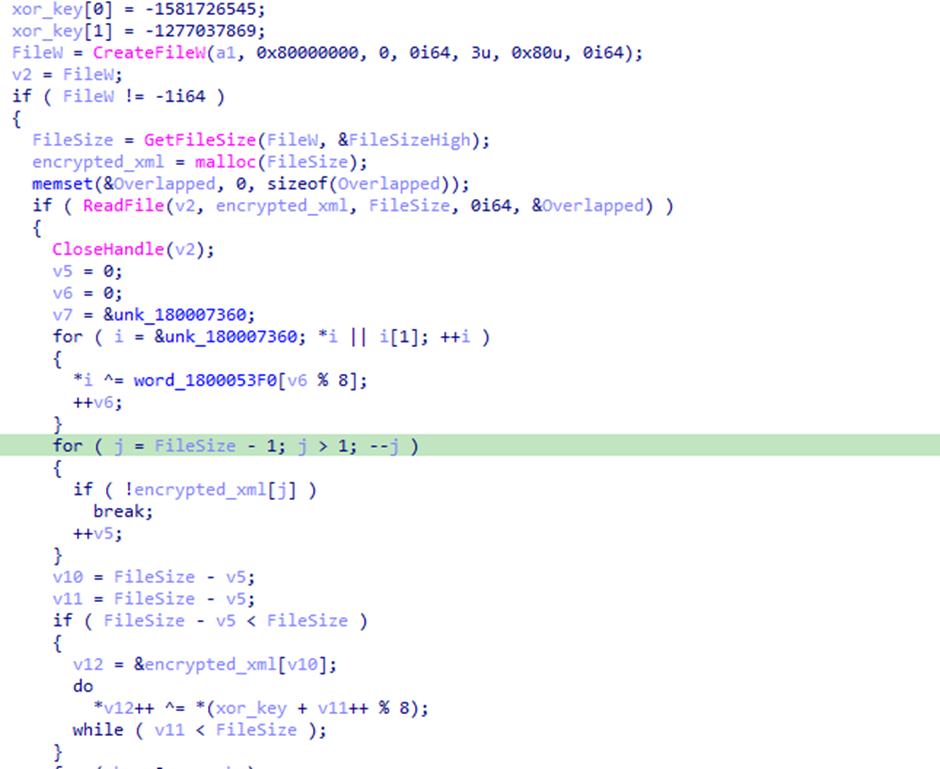 Next, it’ll start reading the aforementioned DOC file starting from the end and going up until a null byte is reached. That blob is then decrypted with a hardcoded XOR key. The content is an XML file that we will discuss later in this article.