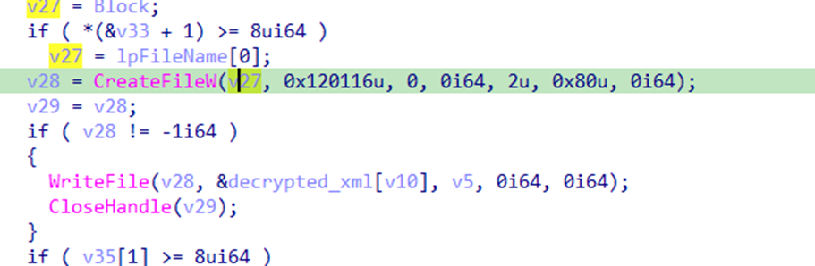 The next step is to decrypt the file name of the XML file that will be created next. This will result in “wctA91F.tmp”.
