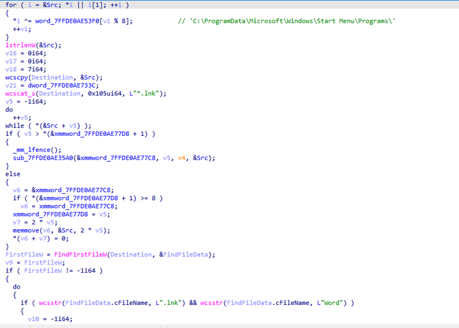 After the decryption routine, the DLL will try to execute the lure document by locating the legitimate Word binary installed on the system. It does this by assuming that a “Start Menu” entry exists for Word.