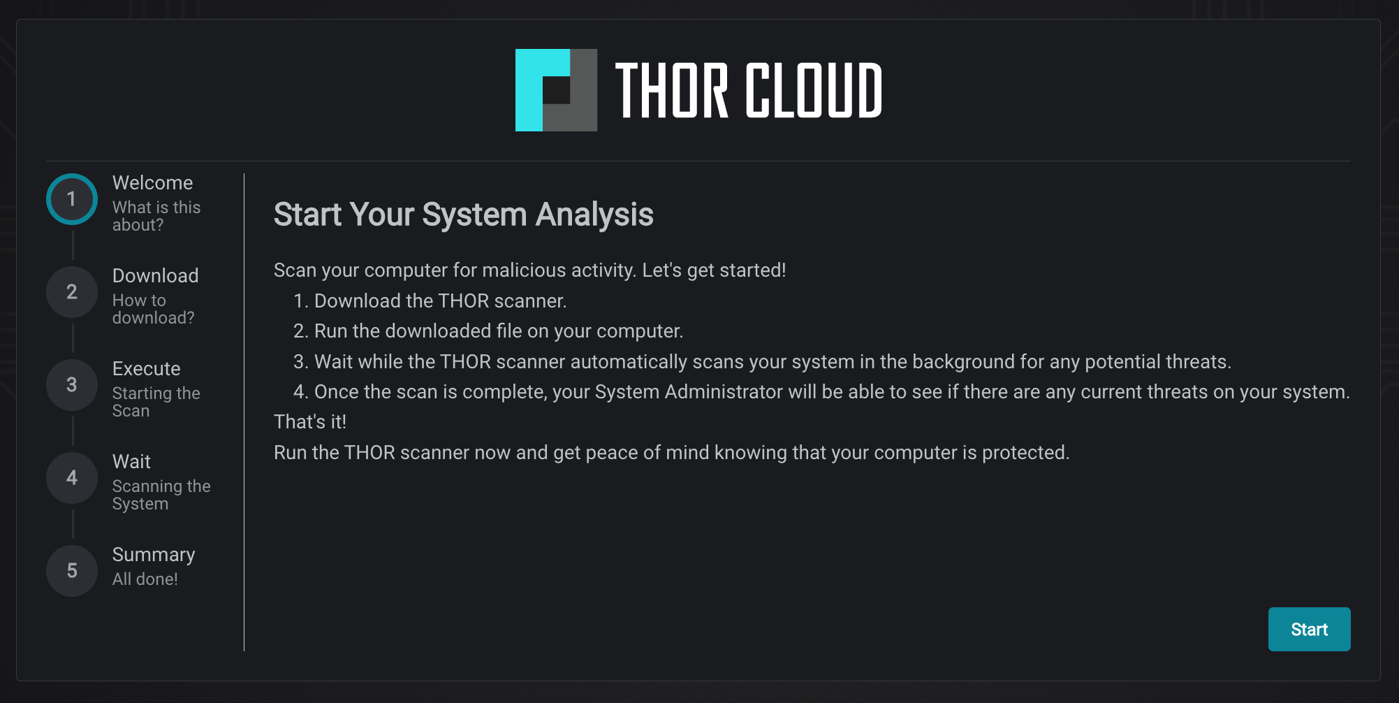 THOR Cloud is built with usability and accessibility in mind, offering step by step guides and extensive documentation for end users and developers. With the guided setup you can simply follow along to deploy THOR Cloud in your environment without any prior knowledge.