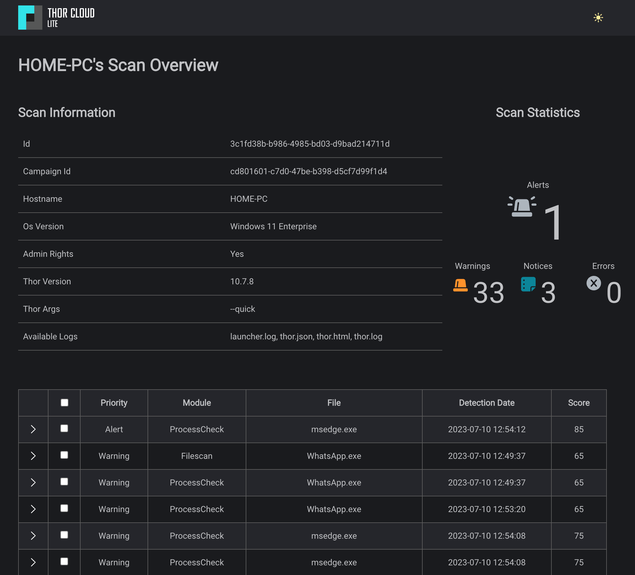 THOR Cloud’s scans offer in-depth insights, serving as a valuable second opinion on security events. Each scan generates various output files, including an HTML report that provides a prioritized view of the scan log.