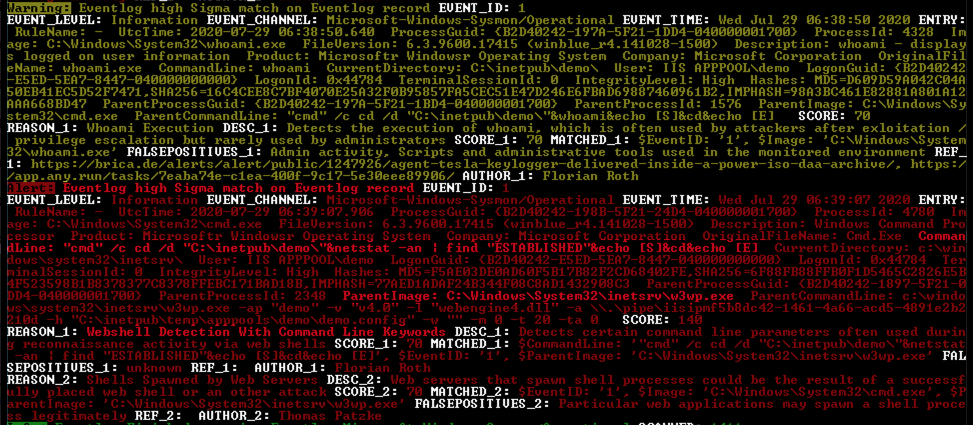 You can easily add you own Sigma rules by placing them in the “./custom-signatures/sigma” sub folder.