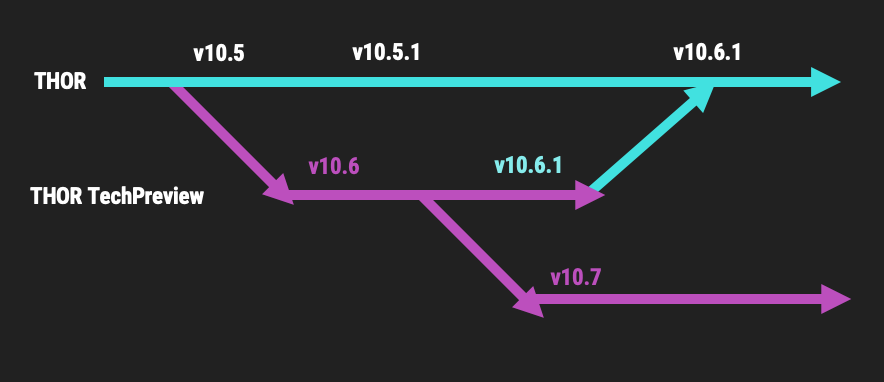 The standard version of THOR remains version 10.5 until the refactored and new features of the TechPreview have been proved to be stable. The expected release cycles of new version of THOR Tech Preview will be once a month, while new minor versions of THOR will be released only twice a year. Both versions receive bugfix updates and use the same signature set.