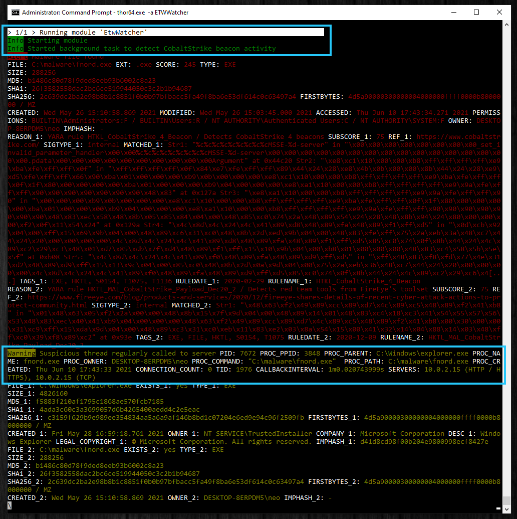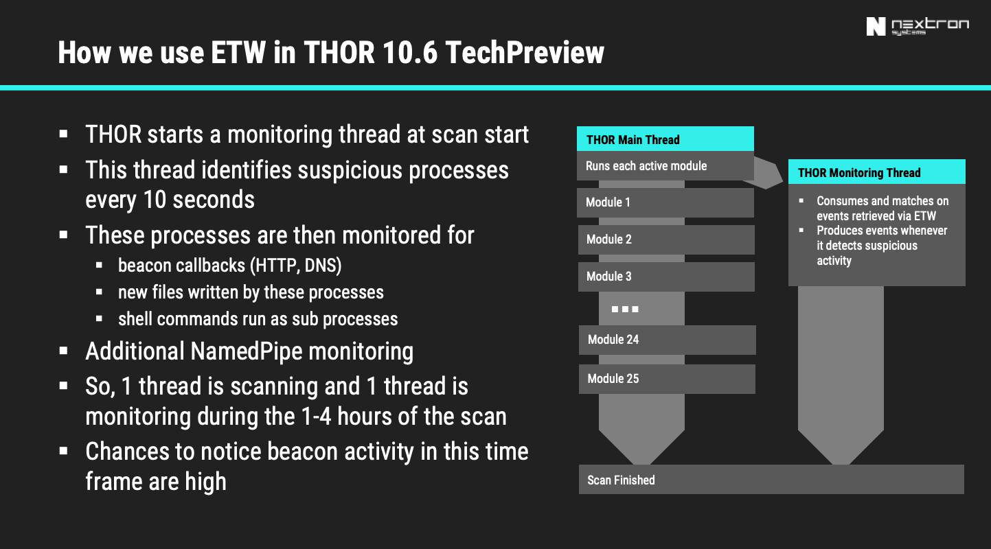 THOR TechPreview version 10.6.8 will introduce a completely new module named ETW Watcher, which runs in a separate thread and monitors the systems during a scan run. As its name indicates, the ETW Watcher module makes use of Event Tracing for Windows (ETW).