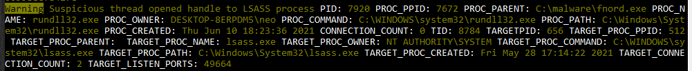 The next example shows the result of a “hashdump” command sent to the beacon. It causes the beacon to open a handle to the LSASS process memory, which THOR detects and reports as a Warning level message.