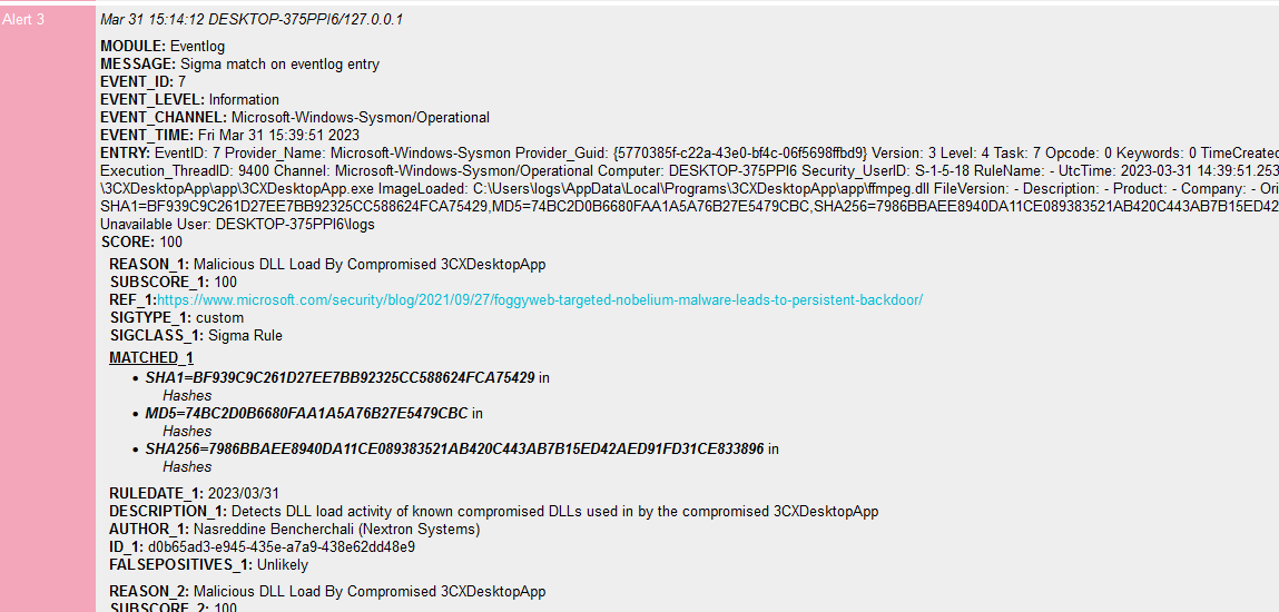 We’re also offering a special license (3cx.lic) to 3CX and their customers that will activate a special feature called “Sigma Scanning” in THOR Lite instances. This allows them to apply the Sigma rules mentioned below (and 1600+ more) on the event logs of a scanned end system.