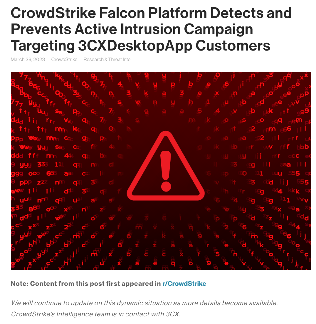On March 29, 2023 CrowdStrike detected malicious activity, originating from a legitimate, signed binary called 3CXDesktopApp. The binary is part of a softphone system developed by 3CX.