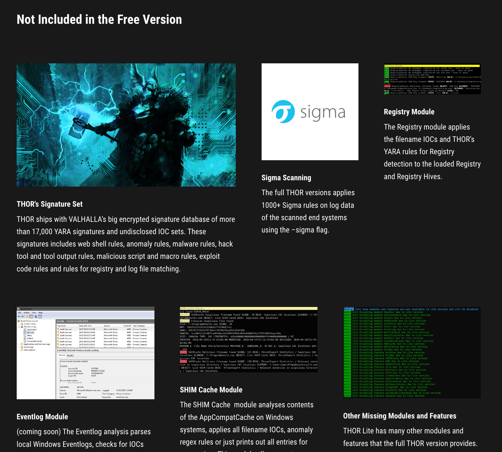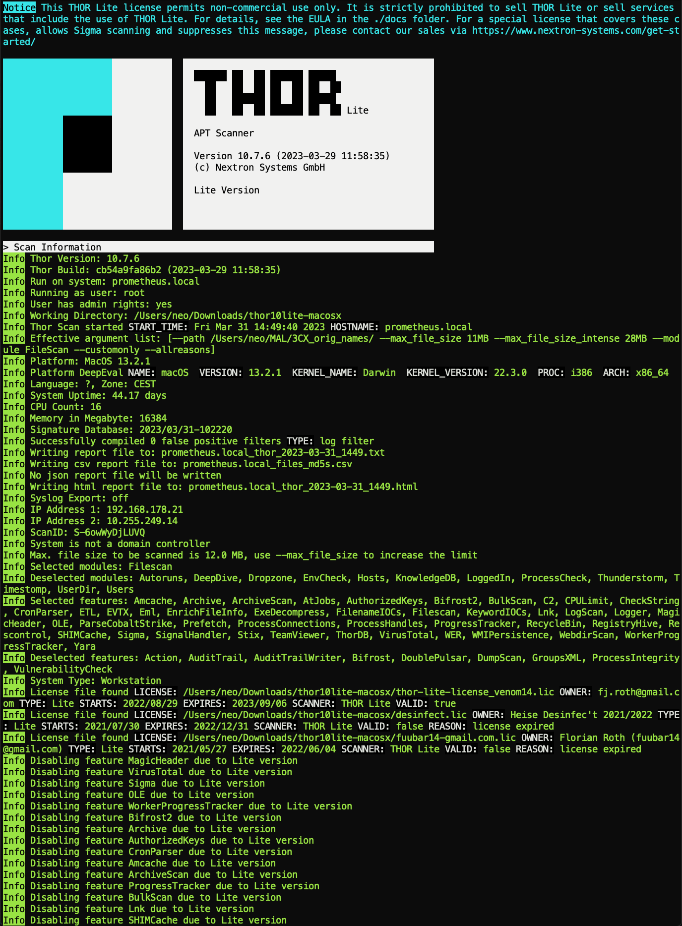 Keep in mind that THOR Lite is only a demo version of our full scanner with more than 27 detection modules and more than 20,000 YARA rues compared to the 5 modules and 2,500 rules used in THOR Lite.