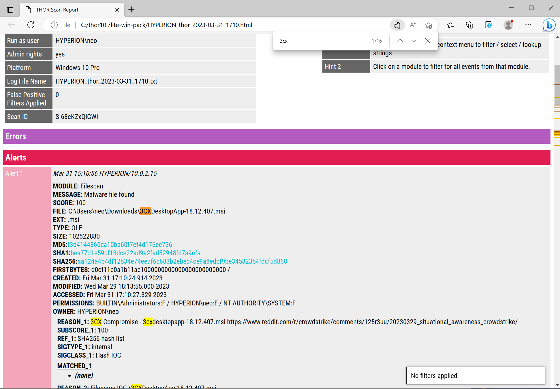 We recommend searching the HTML report for the “3CX” keyword and only review matches with the specific IOCs and YARA rules related to this activity.