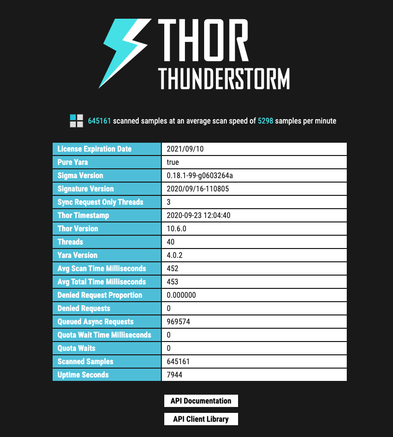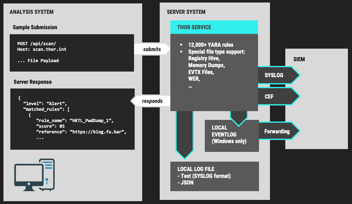 This mode of operation turns THOR into a RESTful web service that is able to process thousands of samples per minute sent from any device within the network.