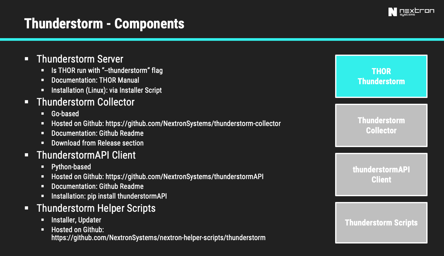 The following slide lists the different components that can be used with THOR Thunderstorm. We provide a server installer script, collectors, a Python API client and update scripts.