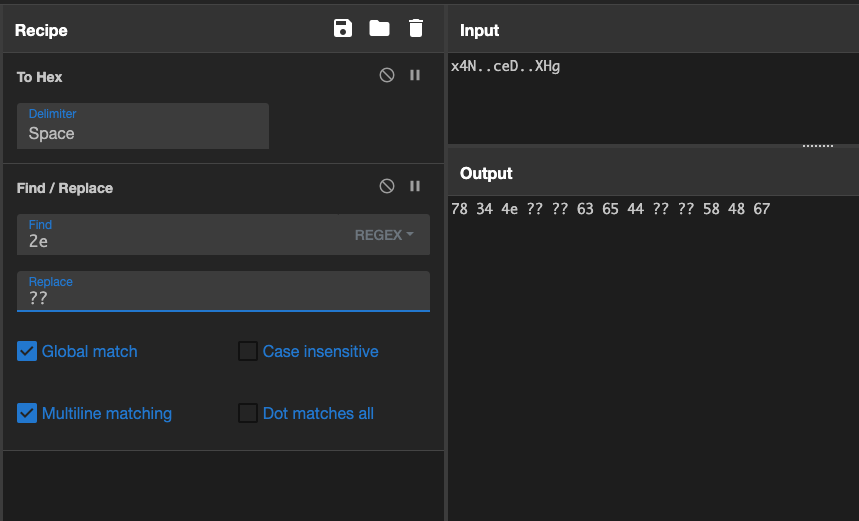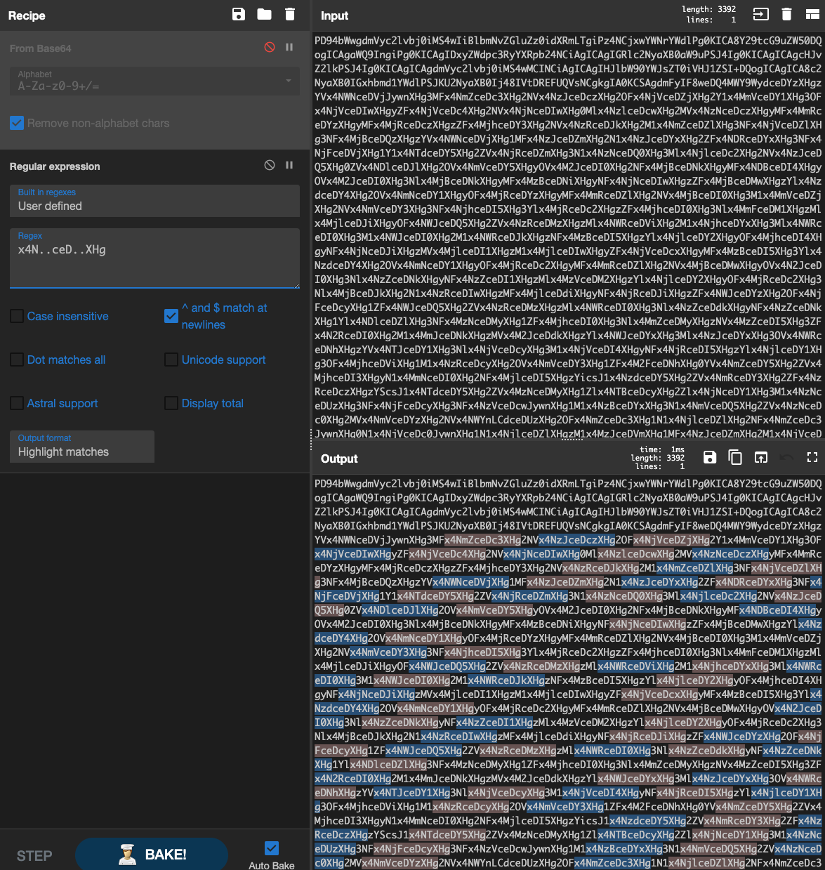 Next we try to figure out the exact usable patterns and put them to the test with different offsets. We use simple regular expressions in CyberChef to highlight matches.