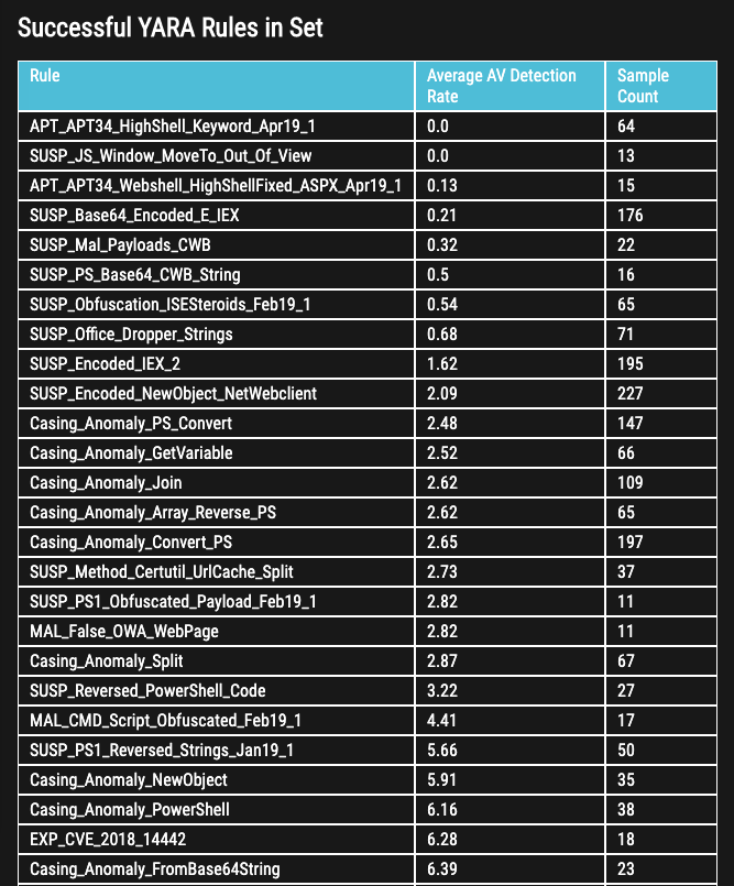 We noticed that many interested parties thought that “threat hunting” YARA rules are just rules with lower scores indicating a lower certainty. But in fact, they’re our most successful rules. The reason behind this is that they focus on anomalies as they appear in obfuscated samples and we’re not just talking about different forms of encoding.