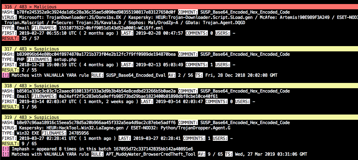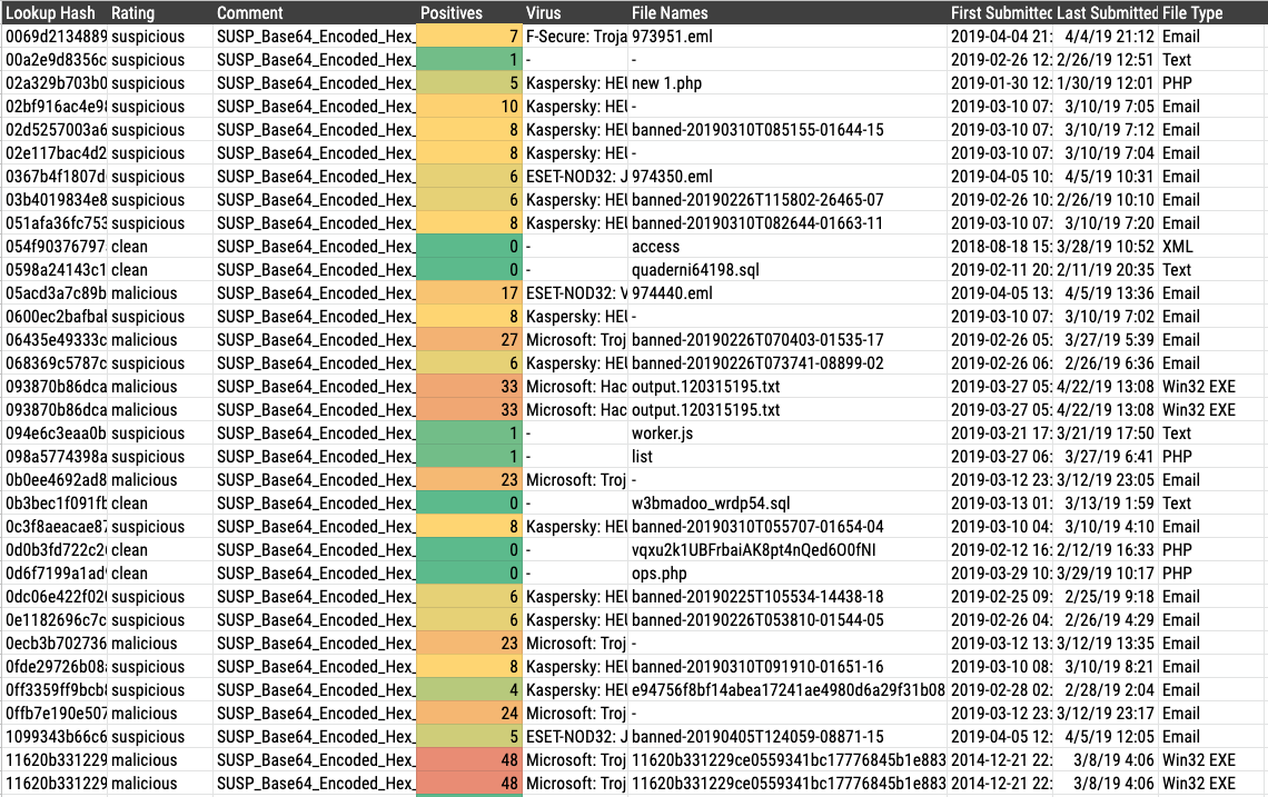 As you can see, it’s not possible to verify the results based on the AV detection ratio. However, it’s a good sign that other threat hunting rules or even rules for known webshells from our ruleset match on these samples as well. We typically evaluate the false positive rate of this type of rules with the help of the file names (e.g. c99.php, virus.txt, *_codexgigas, Virusshare_*) and some spot checks.