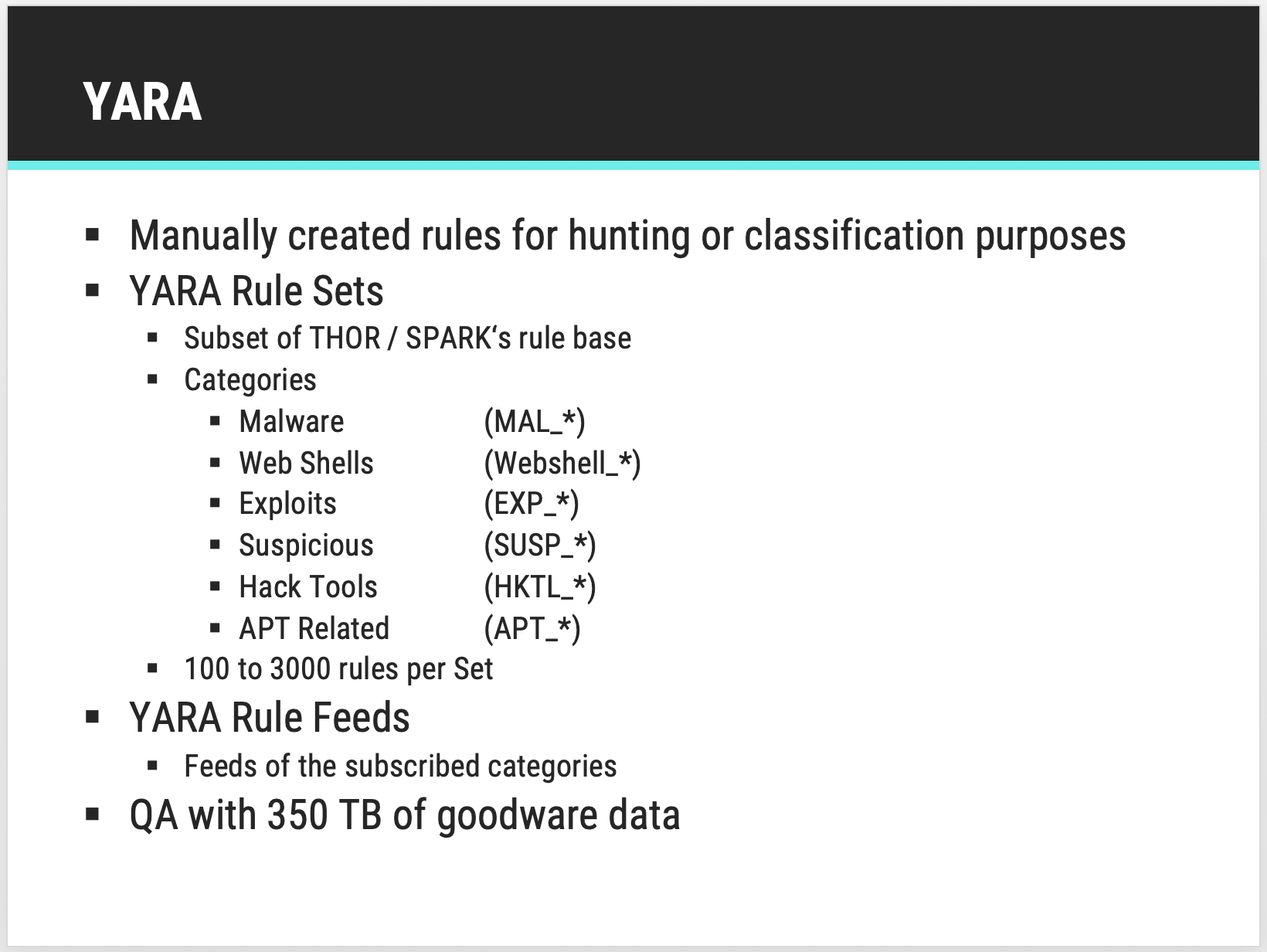 The YARA rule feed is a subscription on our rules. The feed always contains the rules of the last 90 days, which is between 250-400 YARA rules.