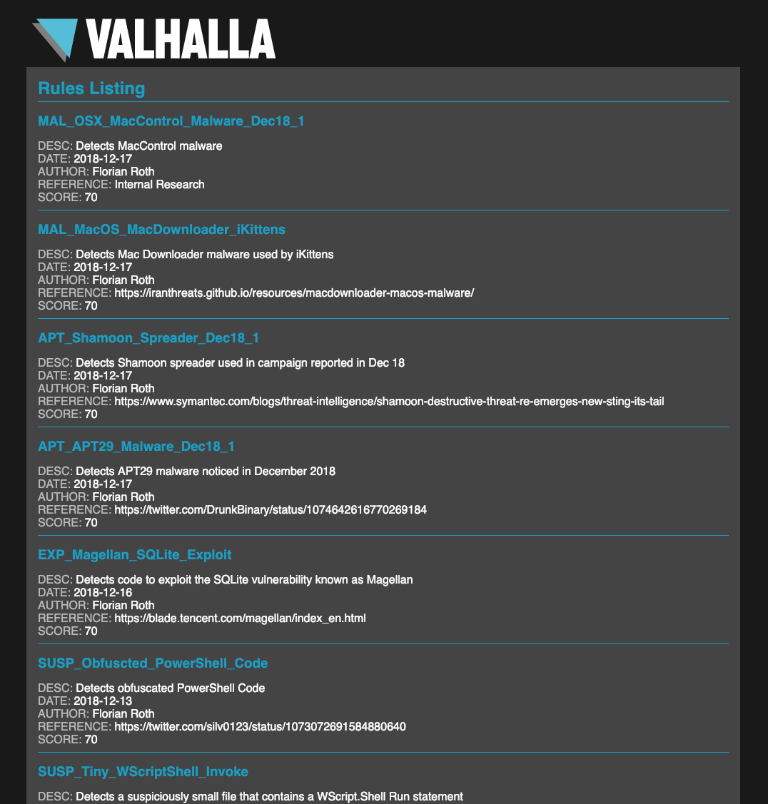 As previously announced our YARA rule packs and feeds will be available in March/April 2019. We’ve put a lot of effort into a internal system named “Mjolnir” that parses, normalizes, filters, tags and automatically modifies our rule base, which contains more than 9000 YARA rules.