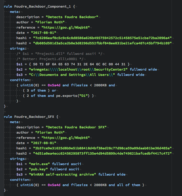 THOR uses YARA as its main signature format. The way how THOR integrates YARA is fully compatible with normal Yara signatures although THOR extends the standard matching in order to allow certain additional checks.
