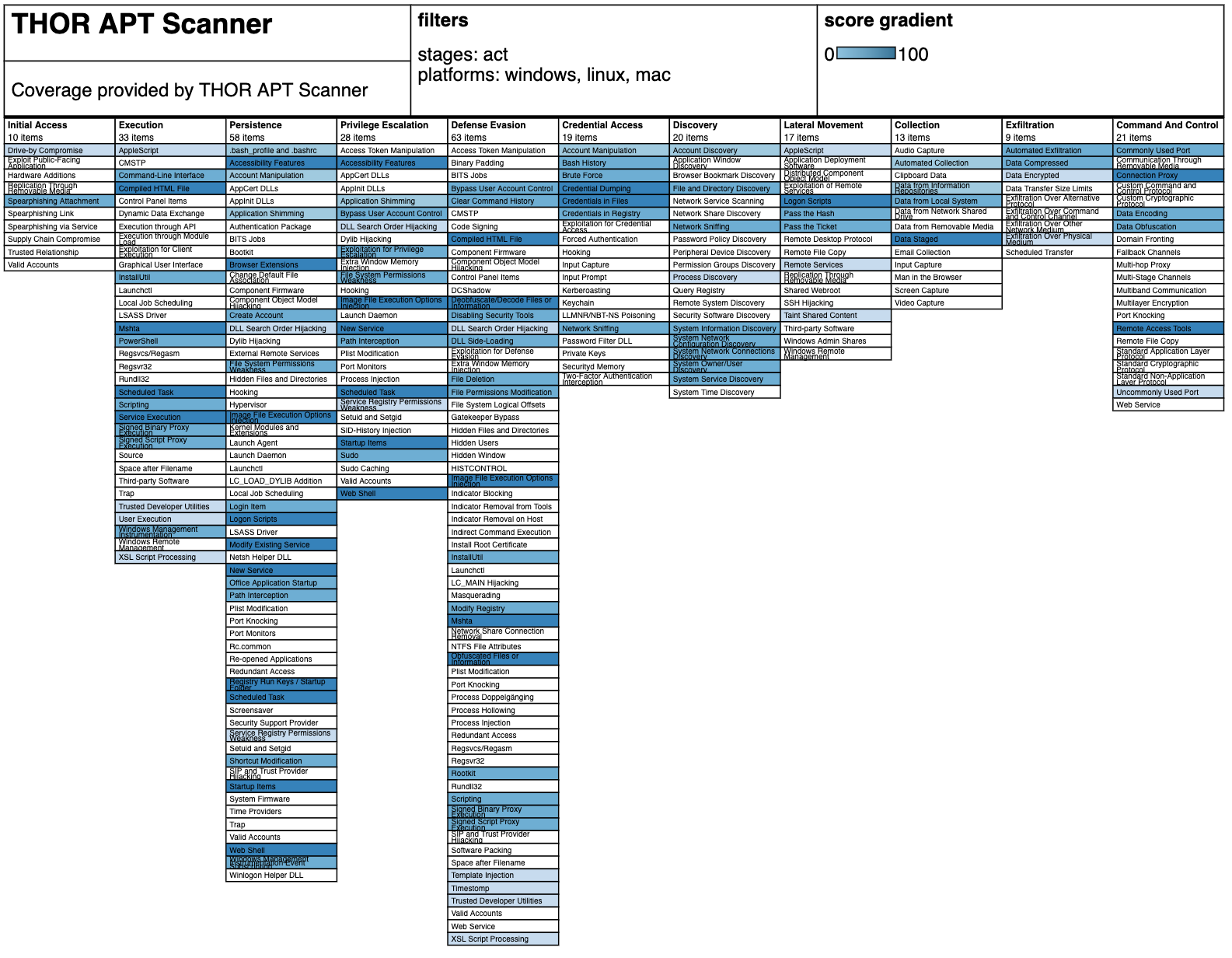 With the ATT&CK Navigator and our JSON file, you can check THOR’s coverage of the respective attack methods.