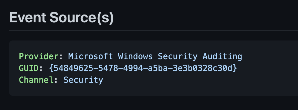 This section will describe the source(s) used by the log-source. As a quick way for the reader to know exactly which channel or ETW provider is required to be able to receive the events.
