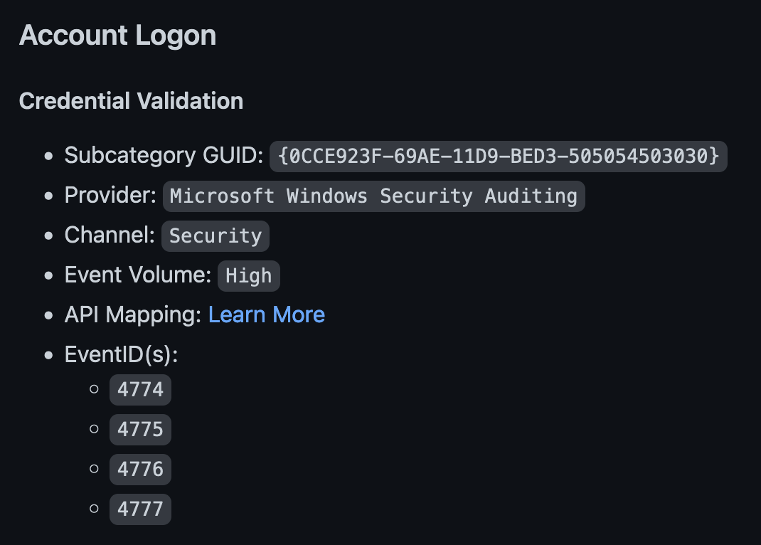 - The “Subcategory GUID” is the GUID for this specific audit policy which can be used with the auditpol command to enable the log (as we’ll see in a little bit).