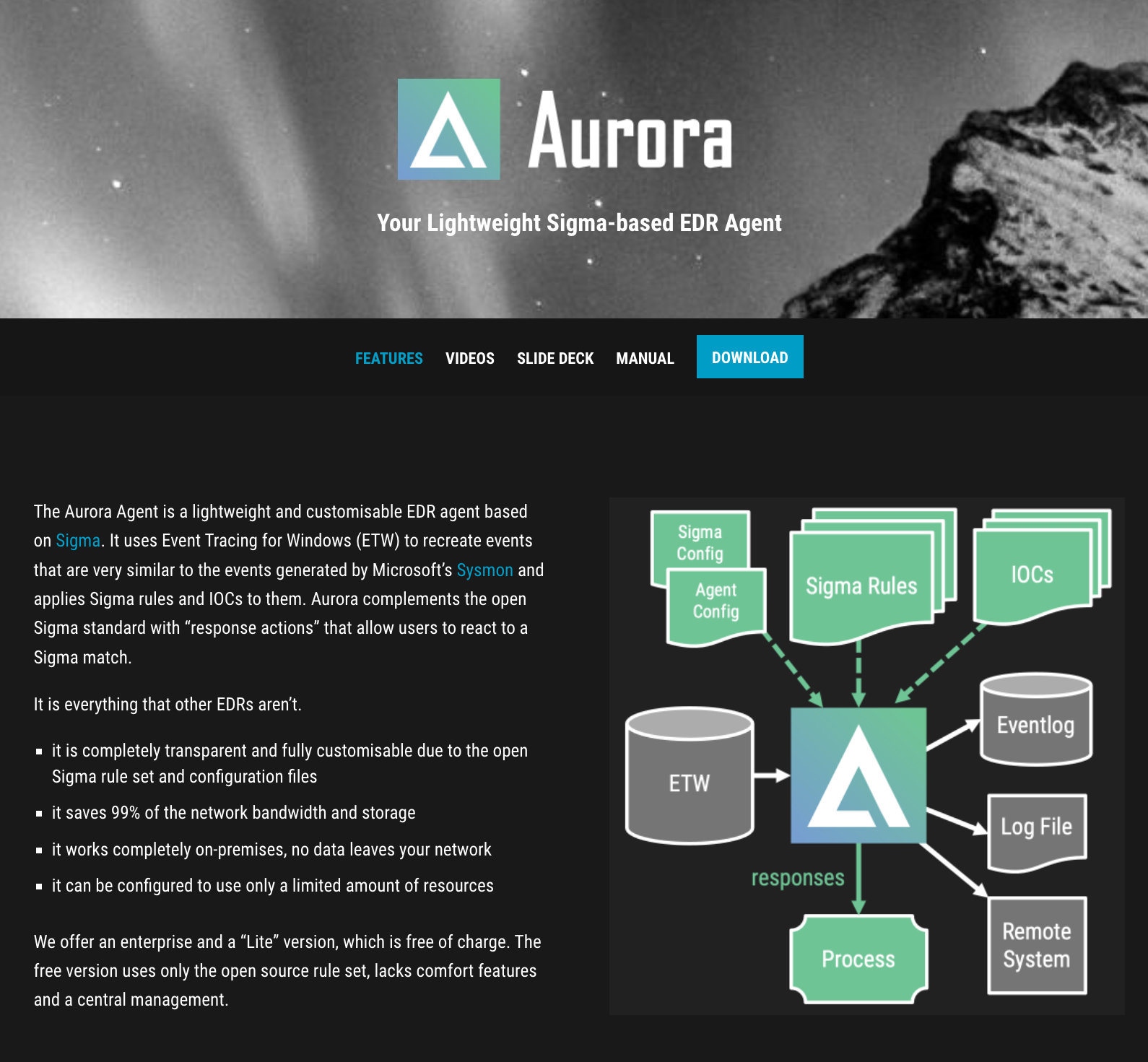 Aurora Lite is a limited but free version of the endpoint agent. It lacks some features, has no additional detection modules, and cannot be used with the comfortable ruleset and configuration management in ASGARD Management Center. The complete list of limitations can be found here.