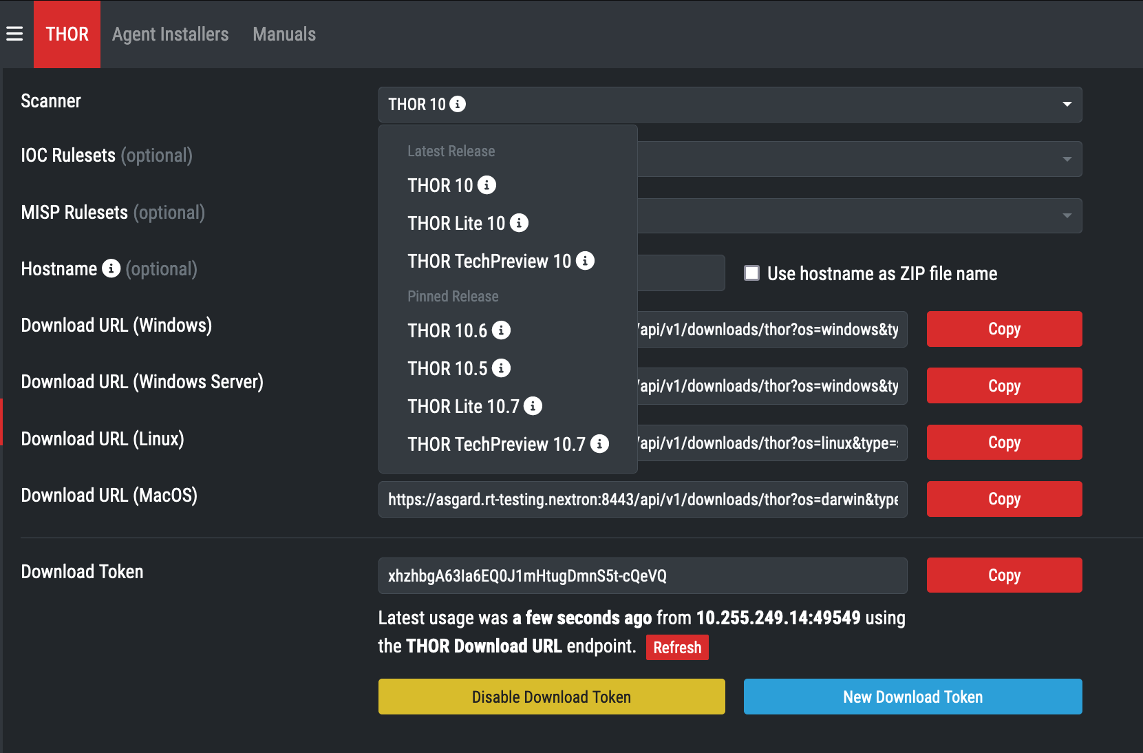 - Reworked THOR download section, which allows to generate links for the “latest available version” and shows an information on the API endpoint usage