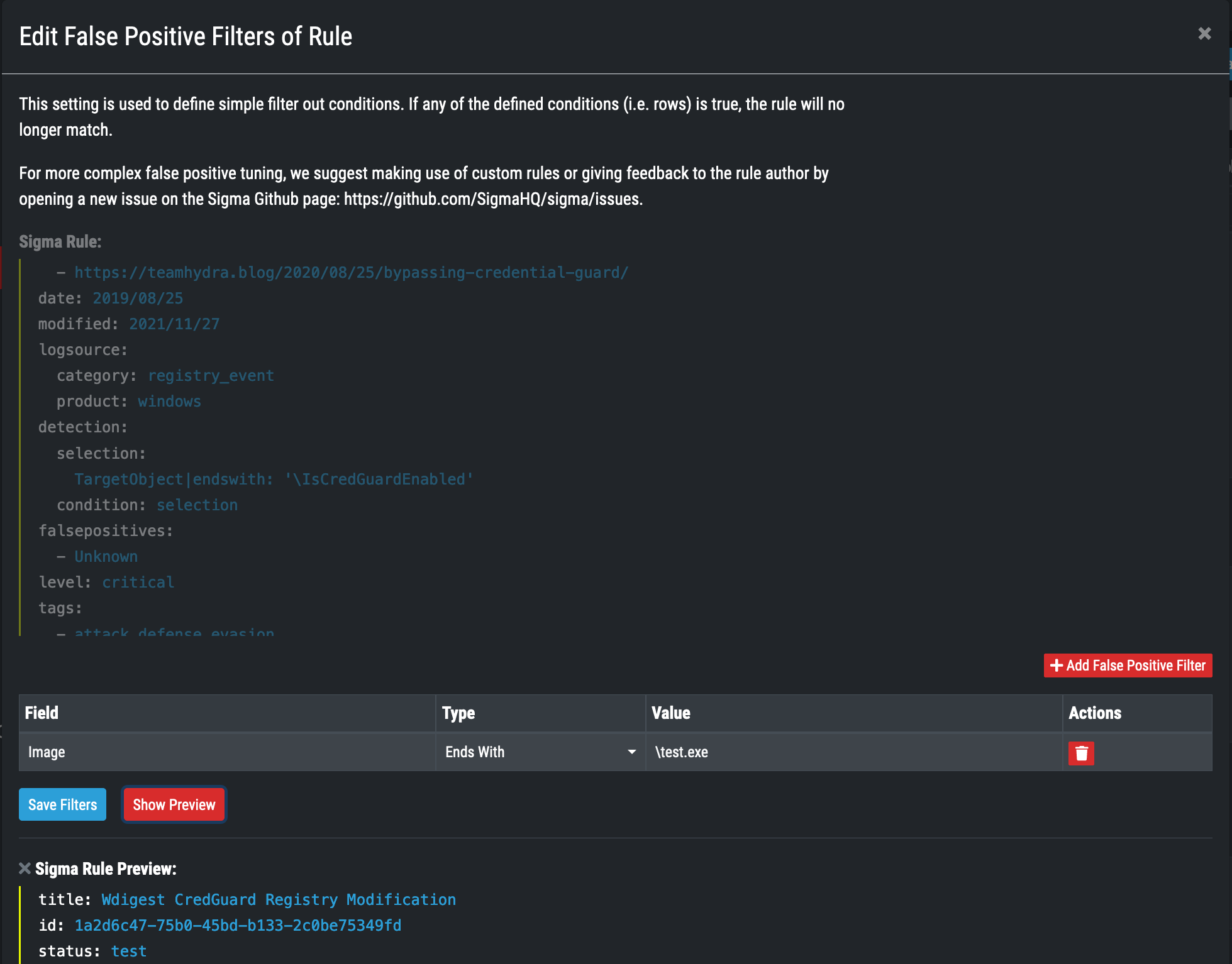The false positive filter enables users to add filters that, instead of changing the original rule, extend it during deployment. This makes it easy to use updated rules with the same custom filter values that are only relevant in the user’s environment.