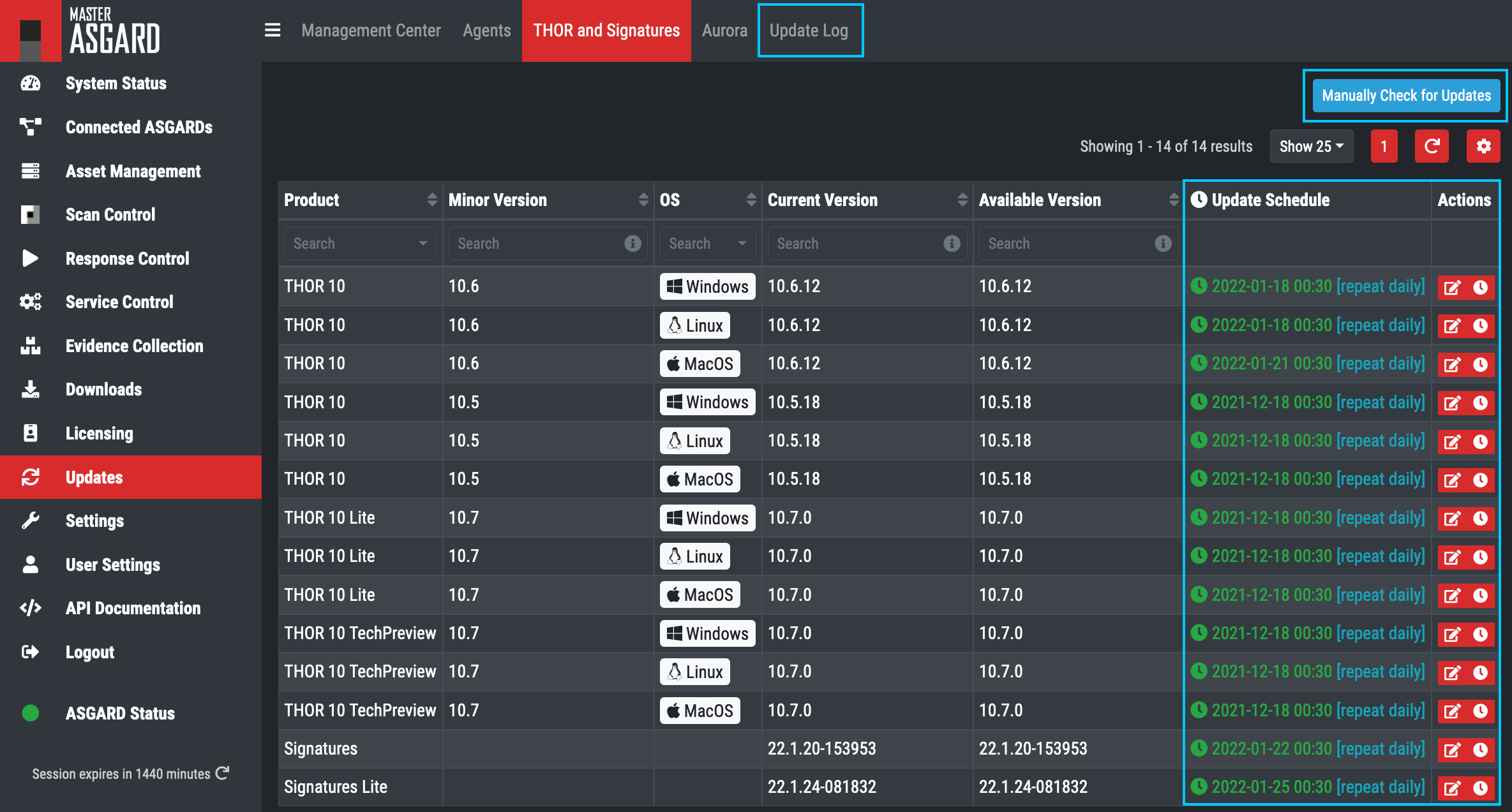 The update section for the scanners and signatures has been revised. Each action has been reworked. Users can now trigger and update manually and check the log of the update process in a separate tab.