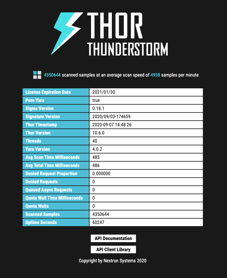 THOR 10.6 is the first version that support a new mode of operation – a RESTful web API service named THOR Thunderstorm. THOR Thunderstorm is able to receive thousands of samples per minute via web requests, scans them and returns a scan result.
