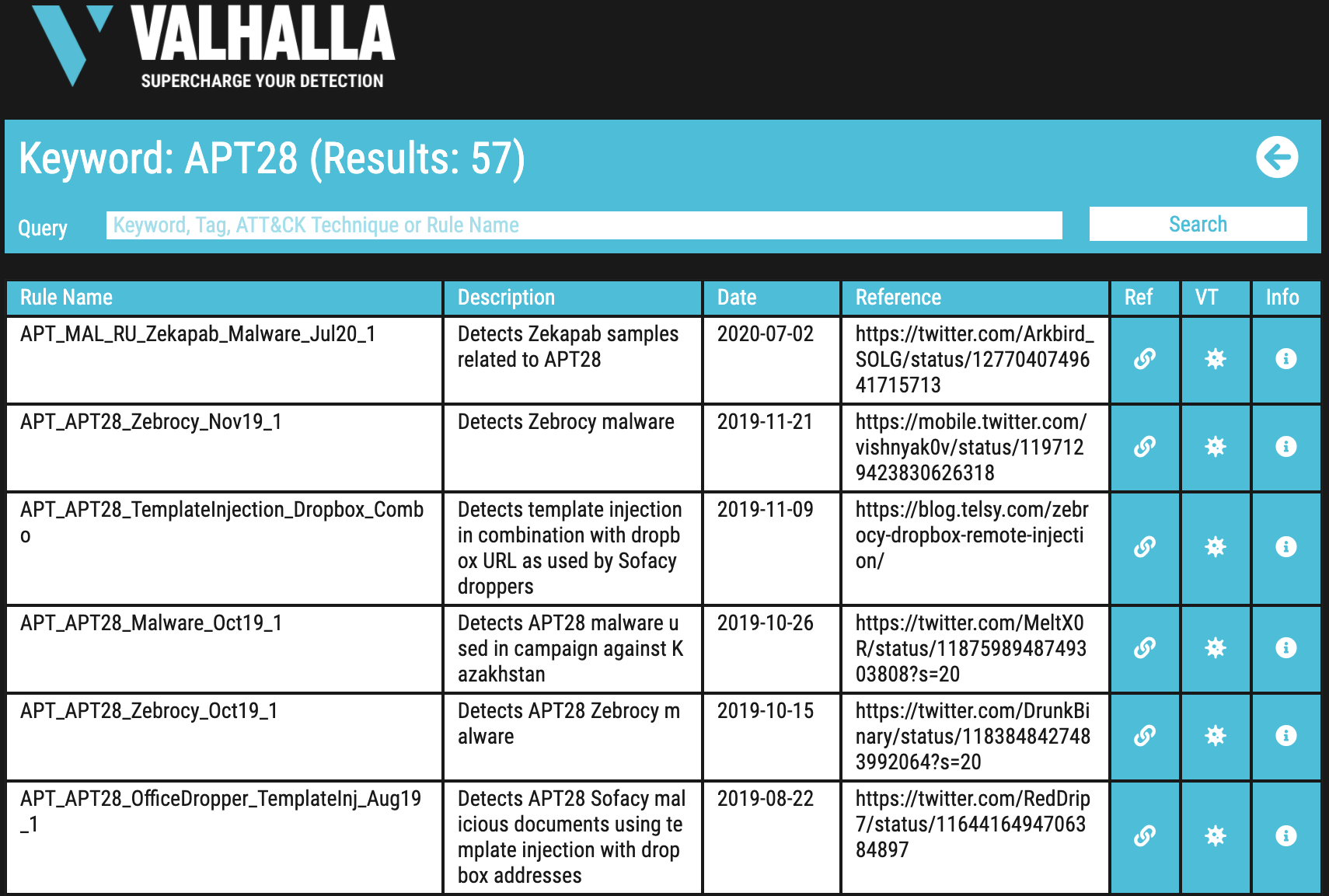 The new search function helps you to determine if VALHALLA and THOR already contain rules for a given report or threat.