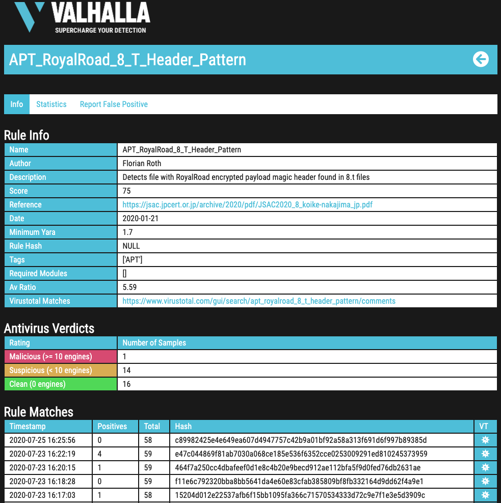 The rule info page contains all the details to a certain rule. These include all metadata values liks score, tags, reference links, required YARA version and modules, the rule date and the average AV detection ratio.
