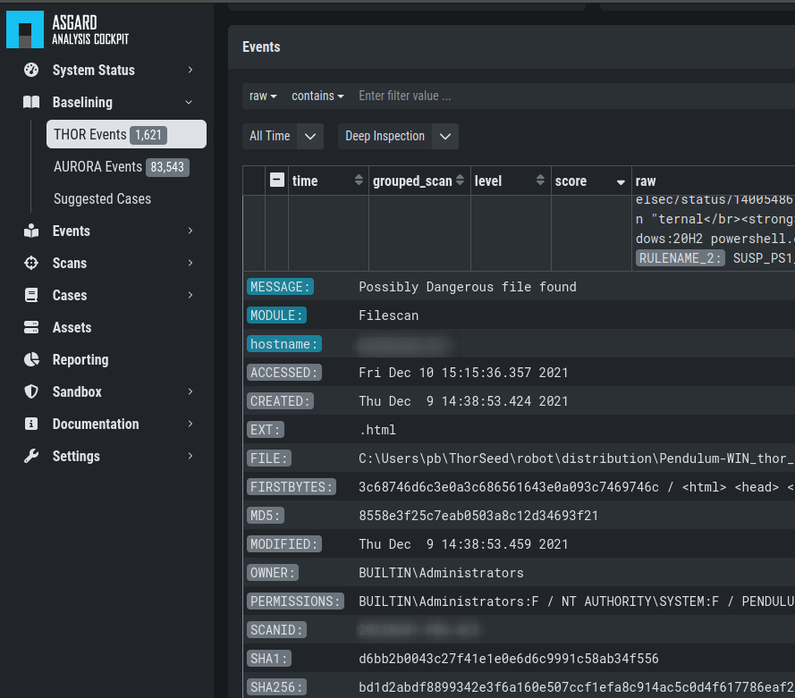 Sample that have been collected by THOR or ADGARD will be stored on the Analysis Cockpit for further investigation. Once a sandbox is connected to the Analysis Cockpit, all samples will be dropped into the sandbox and reports will be retrieved automatically. The Analysis Cockpit ships pre-configured for cuckoo sandbox and with an easy to use API in order to connect to other sandboxes. It is even possible to connect to multiple sandboxes at the same time.