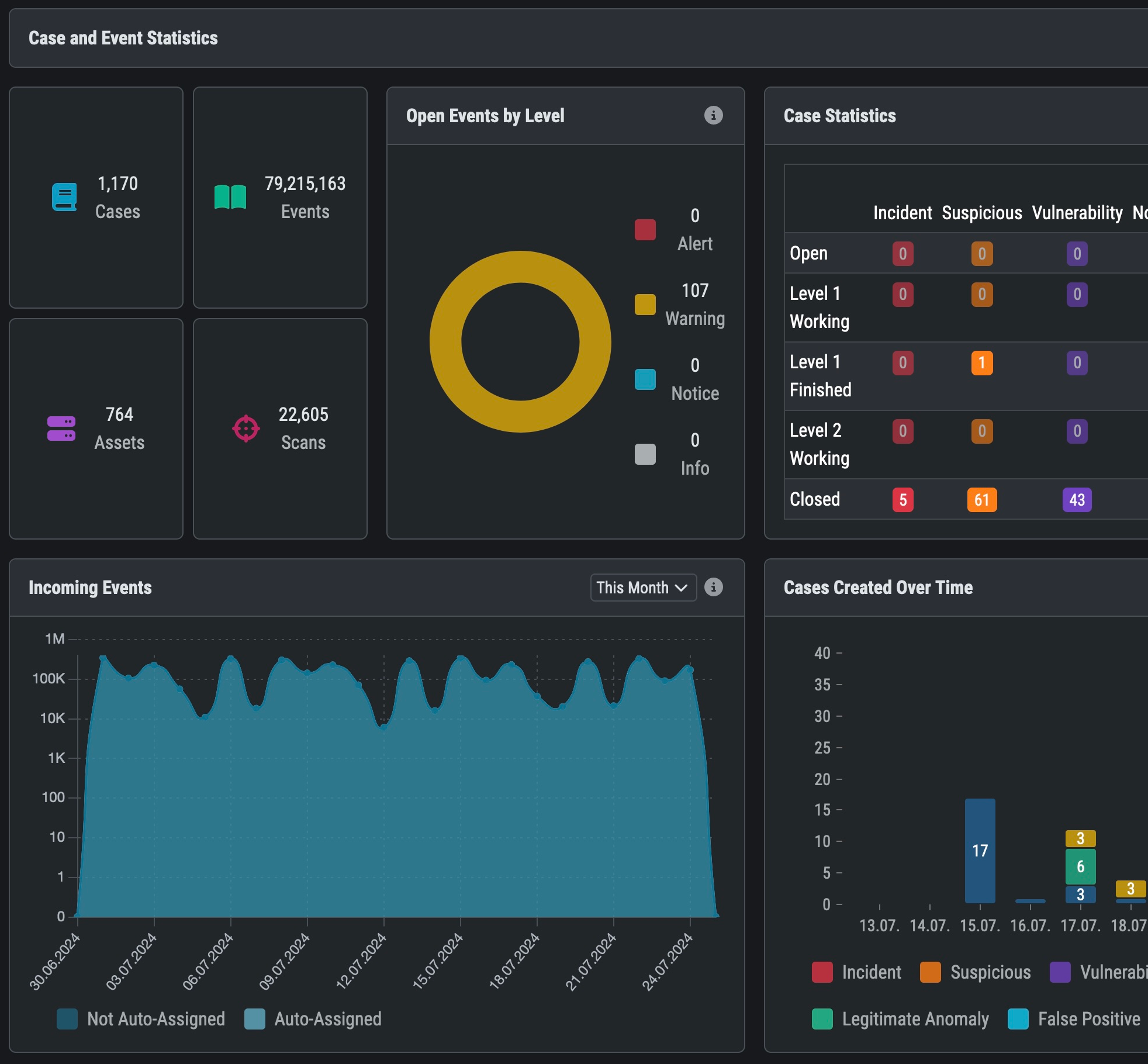 The integrated case management provides an easy to use interface that lets multiple analysts collaborate on the same set of IOC matches. It is highly configurable and supports customizable workflows for multiple analyst groups. The built in two-level analyst model can easily be scaled up to support a multi-level follow the sun SOC. Instead of using the cockpits built-in case management, organisations may decide using the cockpits rich set of APIs to allows handling cases within existing trouble ticket systems, SOAR platforms or within “The Hive”.