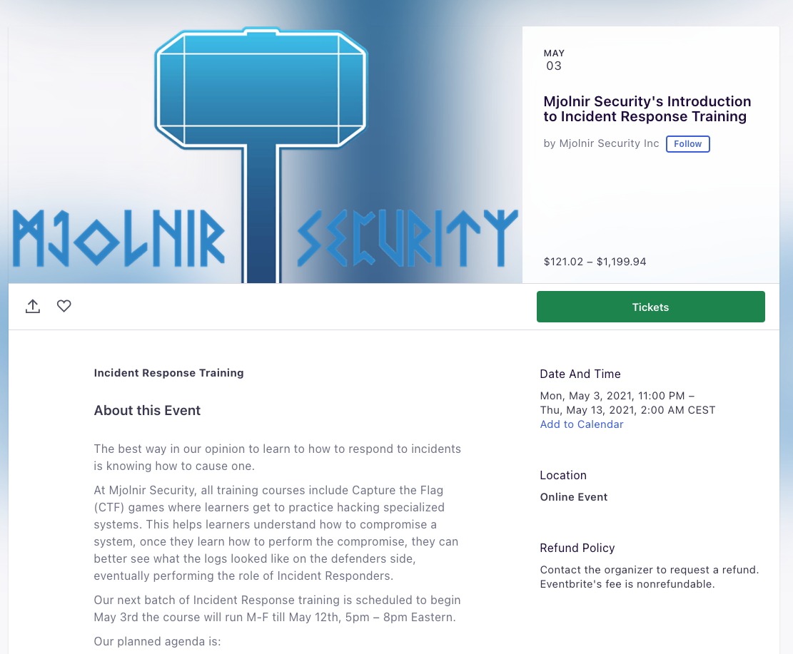 Our partner Mjolnir Security offers a training named “Introduction to Incident Response” from 3th of May to 13th of May.