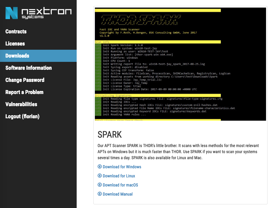 Customers who have bought scanner licenses to scan Servers and Workstations, be it an Enterprise or Host-based license, can use both our scanners THOR and SPARK. If you have bought an Enterprise license for THOR in the past, you are also allowed to download and use this license with SPARK on Linux or macOS endpoints. Download SPARK from the “Downloads” section in the customer portal.