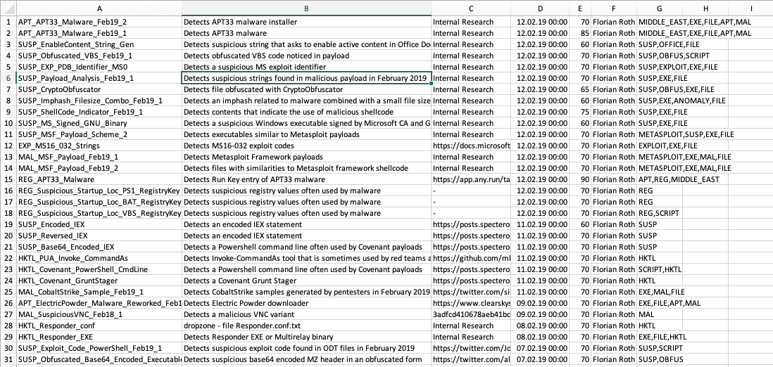 The customer portal contains a CSV with information on all 9973 YARA rules in our signature set (as of 16.02.2019). This way you can verify if a certain threat group or campaign is covered by our rules or not. You can find that CSV in the “Software Information” section together with binary hashes and an update server status on all our products.