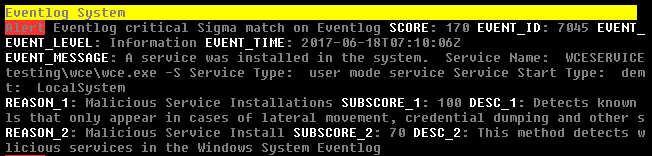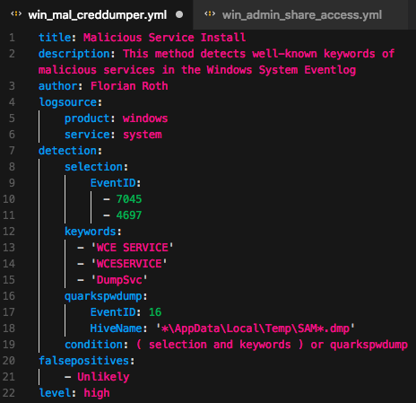 On the right you can see a simple Sigma rule that checks the “System” eventlog for traces of password dumper activity. The detection section contains 1+ identifiers (selection, keywords, quarkspwdump) that can be defined freely by the rule author. These selectors are used in the condition to build the rule.