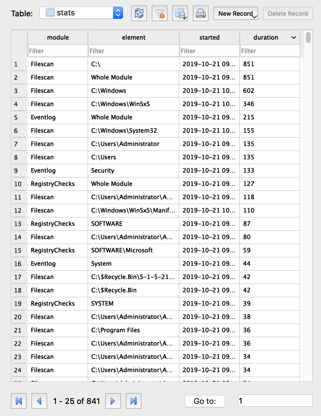 THOR v10.2 features an unencrypted table in THOR DB that shows timing information for the scanned elements. This could help you identifying elements that lengthen scans significantly and determine a time range in which certain elements have been scanned.